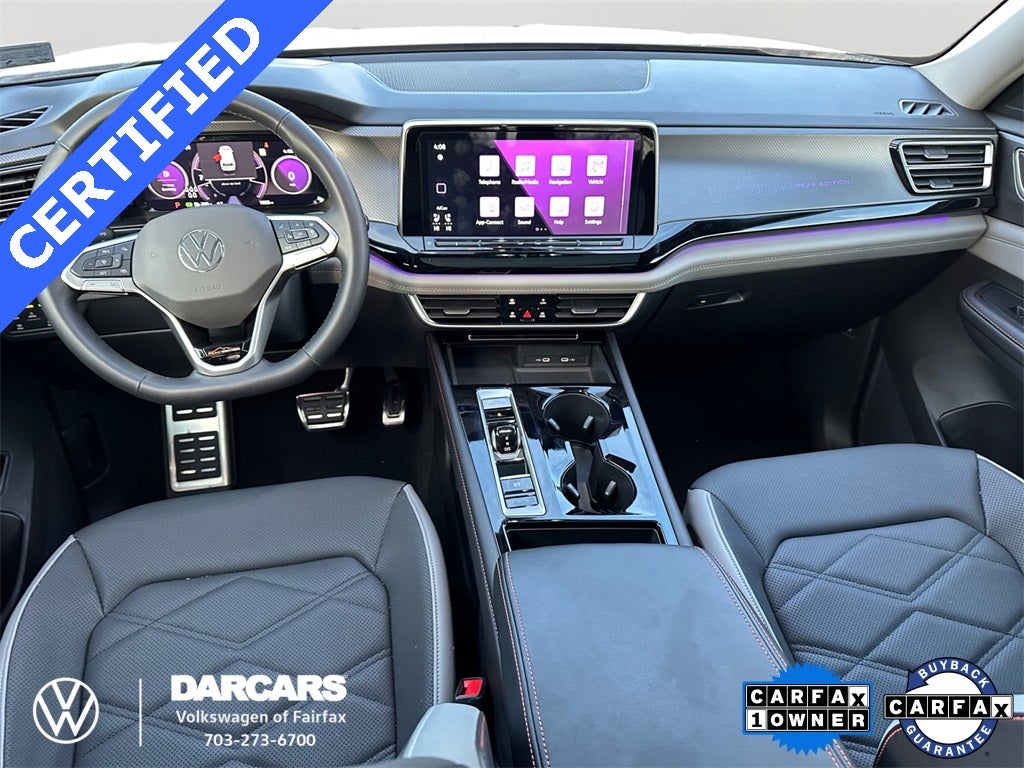 Atlas 2.0T Peak Edition SEL, 4D Sport Utility, 2.0L TSI, 8-Speed Automatic with Tiptronic, AWD, Opal White Pearl, Titan Black w/Orange Stitching w/Perforated V-Tex Leatherette Seating Surfaces, 4-Wheel Disc Brakes, 6 Speakers, ABS brakes, Active Cruise Control, Auto High-beam Headlights, Automatic temperature control, Brake assist, Delay-off headlights, Exterior Parking Camera Rear, Four wheel independent suspension, Front dual zone A/C, Fully automatic headlights, Heads-Up Display, Heated door mirrors, Heated front seats, Heated steering wheel, Heated/Actively Ventilated Front Bucket Seats, Low tire pressure warning, Memory seat, Navigation System, Panic alarm, Perforated V-Tex Leatherette Seating Surfaces, Power door mirrors, Power driver seat, Power Liftgate, Power moonroof: Panoramic, Power steering, Power windows, Radio data system, Radio: MIB3 Discover Media w/Navigation, Rain sensing wipers, Rear air conditioning, Rear window defroster, Rear window wiper, Steering wheel mounted audio controls, Telescoping steering wheel, Tilt steering wheel, Ventilated front seats, VW Care, Wheels: 18 Black Painted 5-Spoke Alloy. Certified.